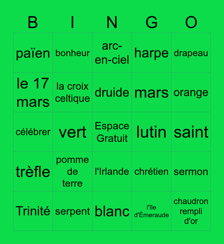 This bingo card has a free space and 36 words: bière, Pierre de Blarney, chou, la croix celtique, chrétien, trèfle, druide, Père, Fils et Saint Esprit, drapeau, trèfle à quatre feuilles, vert, harpe, légende, lutin, orange, païen, défilé, pomme de terre, chaudron rempli d'or, arc-en-ciel, saint, sermon, serpent, Trinité, blanc, bonheur, célébrer, chasser, mars, le 17 mars, l'hiver, le printemps, l'île d'Émeraude, l'Irlande, irlandais and gaélique.