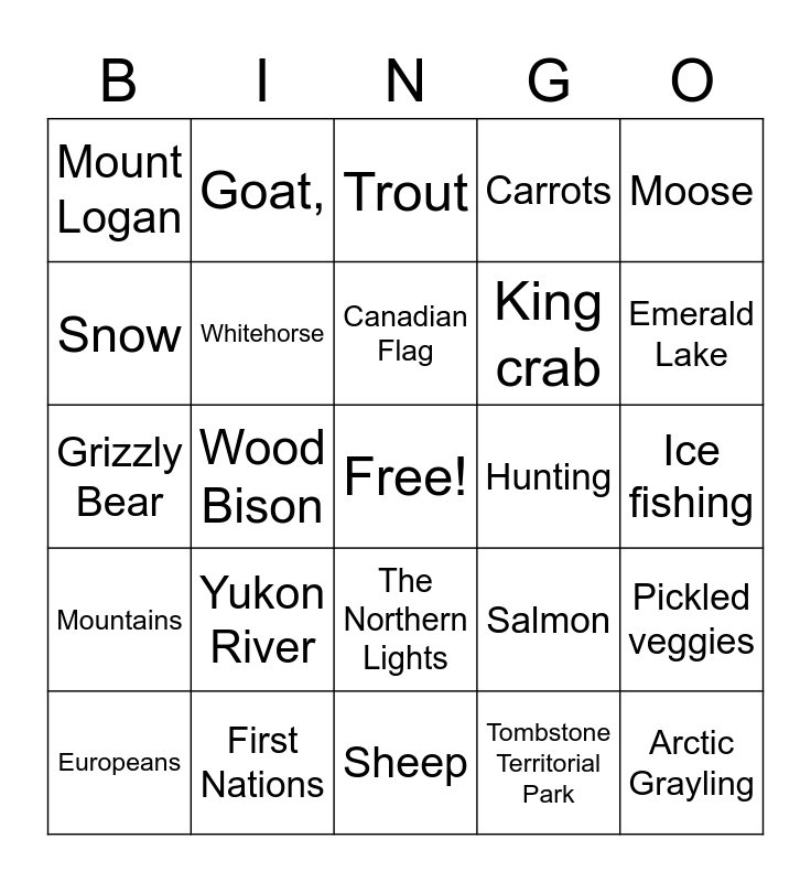 This bingo card has a free space and 36 words: Bannock, Berry Pie, Oat Crop field, Whitehorse, Salmon, Mountains, Canadian Flag, Gold, Moose, Caribou, Wood Bison, Carrots, Beets, Hunting, Emerald Lake, Mount Logan, Halibut, Yukon River, Arctic Grayling, Trout, Ice fishing, Pickled veggies, First Nations, Europeans, Sheep, Goat,, Grizzly Bear, Deer, King crab, Snow, Rain, Hail, Tombstone Territorial Park, The Northern Lights, Dawson City Museum and Miles canyon.