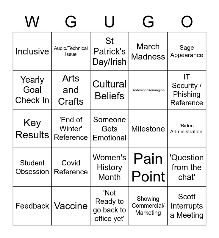 This bingo card has a free space and 24 words: Covid Reference, Vaccine, Cultural Beliefs, Feedback, Sage Appearance, Inclusive, Yearly Goal Check In, Audio/Technical Issue, Milestone, Women's History Month, Redesign/Reimagine, Key Results, Pain Point, 'Question from the chat', Arts and Crafts, Showing Commercial/ Marketing, 'Biden Administration', St Patrick's Day/Irish, IT Security / Phishing Reference, 'End of Winter' Reference, Scott Interrupts a Meeting, Student Obsession, March Madness and 'Not Ready to go back to office yet'.