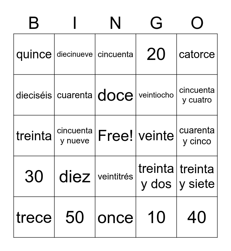 This bingo card has a free space and 25 words: diez, once, doce, trece, catorce, quince, dieciséis, diecinueve, veinte, veintitrés, veintiocho, treinta, treinta y dos, treinta y siete, cuarenta, cuarenta y uno, cuarenta y cinco, cincuenta, cincuenta y cuatro, cincuenta y nueve, 40, 50, 30, 20 and 10.