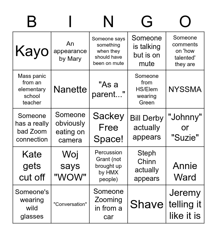 This bingo card has a free space and 24 words: Woj says "WOW", "Conversation", "As a parent...", Someone's wearing wild glasses, Someone comments on 'how talented' they are, Kayo, Mass panic from an elementary school teacher, An appearance by Mary, Bill Derby actually appears, Percussion Grant (not brought up by HMX people), Someone from HS/Elem wearing Green, Someone has a really bad Zoom connection, Steph Chinn actually appears, Annie Ward, Nanette, Shave, "Johnny" or "Suzie", Someone says something when they should have been on mute, NYSSMA, Someone obviously eating on camera, Jeremy telling it like it is, Kate gets cut off, Someone is talking but is on mute and Someone Zooming in from a car.