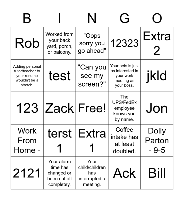 This bingo card has a free space and 27 words: Coffee intake has at least doubled., Realizing you are on mute after talking for 30 seconds., Your pets is just as interested in your work meeting as your boss., Your child/children has interrupted a meeting., Adding personal tutor/teacher to your resume wouldn't be a stretch., "Oops sorry you go ahead", Worked from your back yard, porch, or balcony., Work From Home -, The UPS/FedEx employee knows you by name., Dolly Parton - 9-5, 123, 12323, 2121, Your alarm time has changed or been cut off completey., jkld, jkl, test, "Can you see my screen?", terst 1, Rob, Jon, Ack, Zack, Bill, Extra 1, Extra 2 and Extra 3.