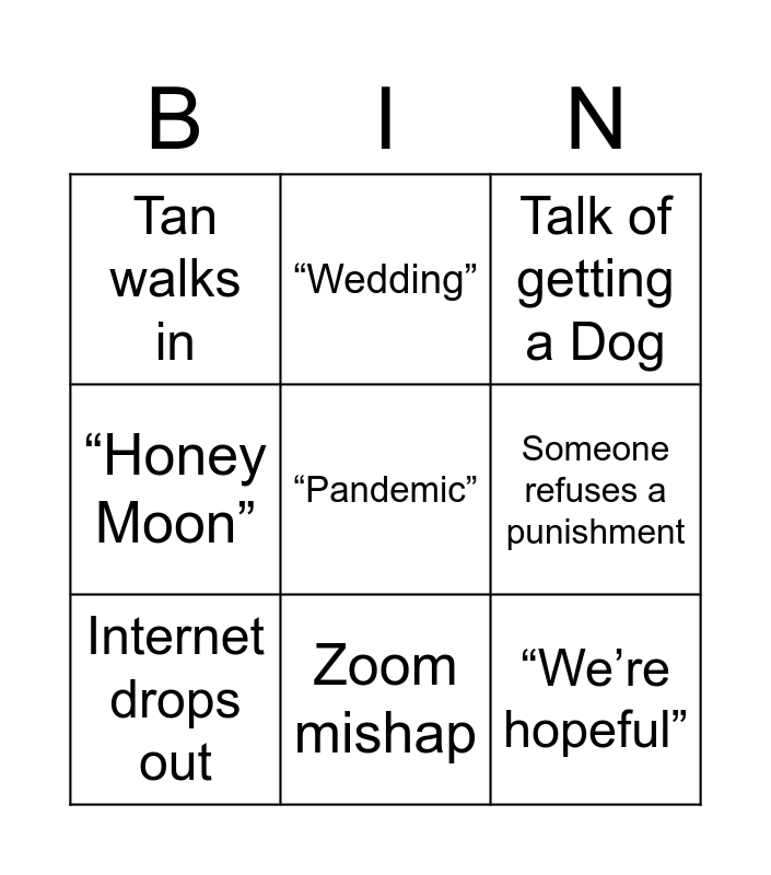 This bingo card has 13 words: Tan’s name mentioned, Says “Aye”, Internet drops out, “Wedding”, “Honey Moon”, “Pandemic”, “We’re hopeful”, “Cake”, Zoom mishap, Tan walks in, Someone refuses a punishment, Talk of getting a Dog and Talk of having kids.