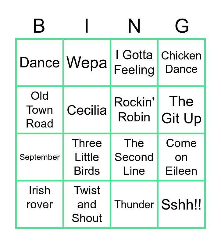 This bingo card has 16 words: Twist and Shout, Come on Eileen, I Gotta Feeling, Dance, September, Wepa, The Second Line, Thunder, Old Town Road, Cecilia, Irish rover, Chicken Dance, Three Little Birds, The Git Up, Rockin' Robin and Sshh!!.