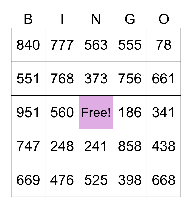 This bingo card has a free space and 24 words: 669, 248, 373, 398, 78, 840, 777, 563, 186, 341, 951, 768, 858, 438, 551, 476, 525, 555, 661, 747, 560, 241, 756 and 668.