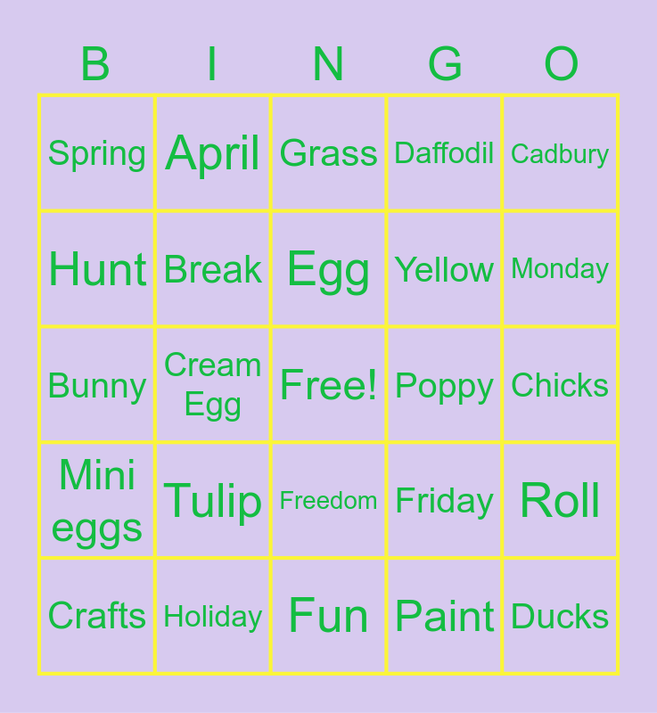 This bingo card has a free space and 40 words: Pink, Bunny, Rabbit, Break, Holiday, Freedom, Egg, Chocolate, Cadbury, Mini eggs, Cream Egg, Daffodil, Ducks, Chicks, Poppy, Tulip, Daisy, Spring, Sun, Grass, Roll, Paint, Yellow, Hunt, Bonnet, Basket, Carrot, Fluffy, Feathers, Pattern, Pancakes, Crafts, Field, Friday, Monday, Fun, Bouquet, March, April and Lamb.