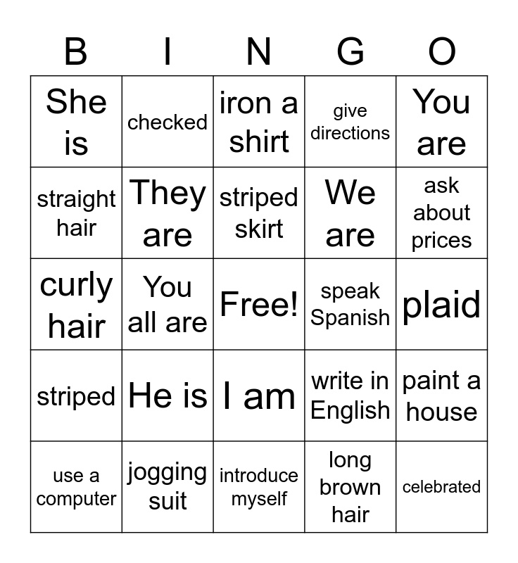 This bingo card has a free space and 24 words: He is, jogging suit, striped skirt, use a computer, You are, She is, straight hair, checked, speak Spanish, I am, We are, curly hair, write in English, paint a house, They are, long brown hair, plaid, iron a shirt, ask about prices, You all are, celebrated, striped, give directions and introduce myself.