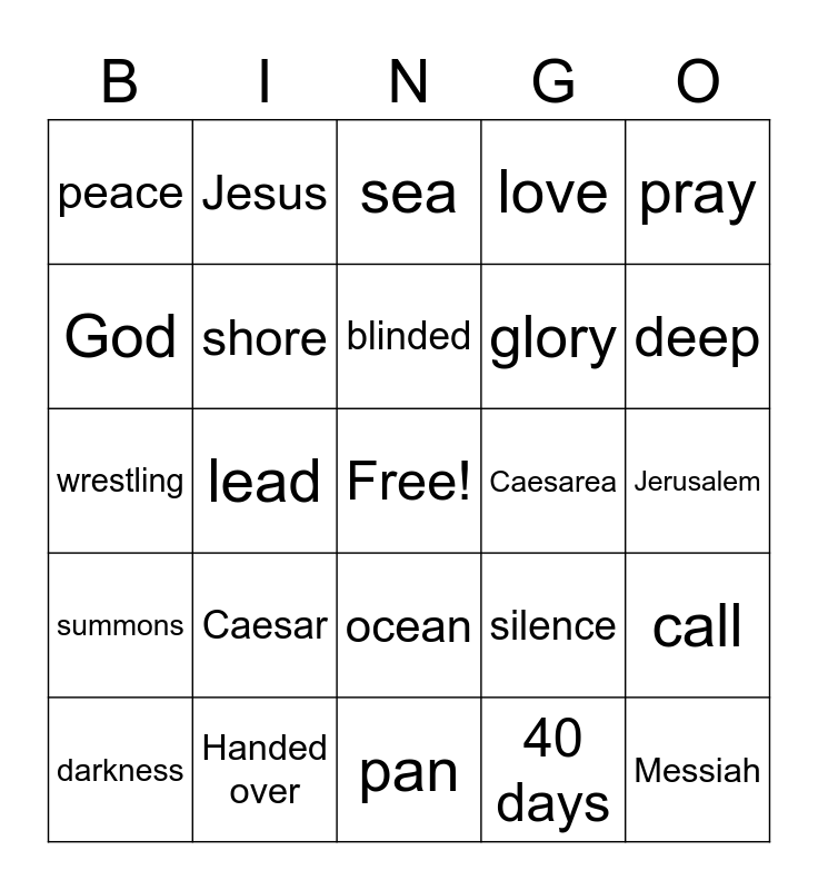 This bingo card has a free space and 29 words: darkness, follow, lead, lighthouse, peace, sea, shore, Caesar, Caesarea, Handed over, Jerusalem, Messiah, pan, 40 days, deep, footsteps, ocean, summons, pray, wrestling, silence, tomorrow, glory, God, love, Jesus, call, blinded and name.