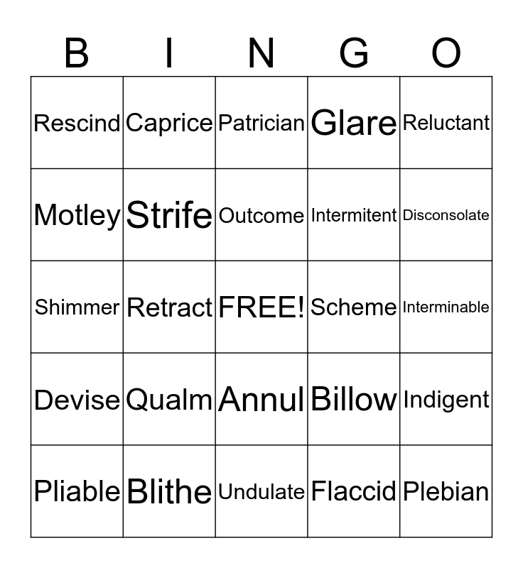 This bingo card has a free space and 24 words: Qualm, Blithe, Outcome, Pliable, Reluctant, Rescind, Motley, Caprice, Scheme, Annul, Intermitent, Shimmer, Billow, Indigent, Strife, Flaccid, Interminable, Patrician, Disconsolate, Retract, Plebian, Devise, Glare and Undulate.