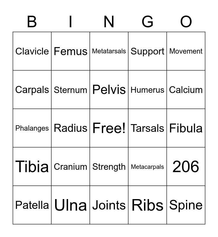 This bingo card has a free space and 24 words: Cranium, Ulna, Pelvis, Patella, Movement, Clavicle, Carpals, Femus, Tarsals, Strength, Humerus, Phalanges, Metacarpals, 206, Sternum, Ribs, Fibula, Metatarsals, Calcium, Radius, Spine, Tibia, Support and Joints.