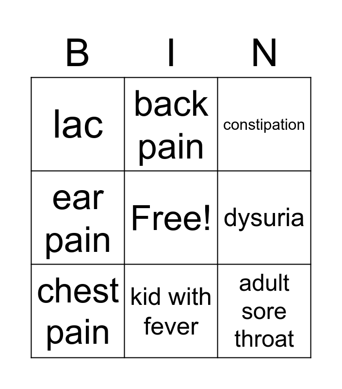 This bingo card has a free space and 11 words: Drunk, kid with fever, adult sore throat, chest pain, back pain, constipation, dysuria, headache, ear pain, lac and fall.