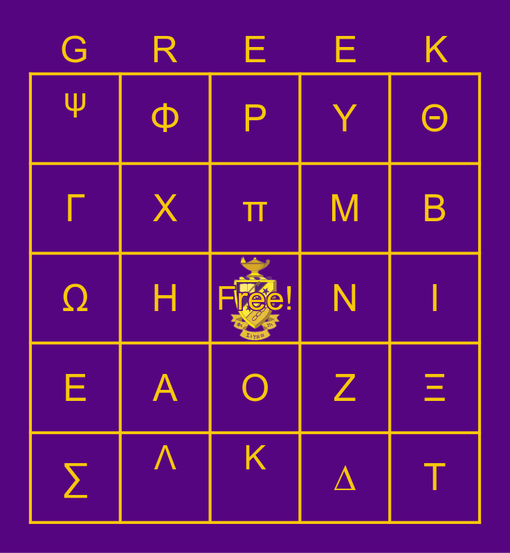 This bingo card has a free space and 24 words: A, Λ, π, ∑, Θ, ψ, Γ, Φ, N, O, M, Ω, Z, Ξ, X, ∆, I, P, B, H, T, E, Y and K.