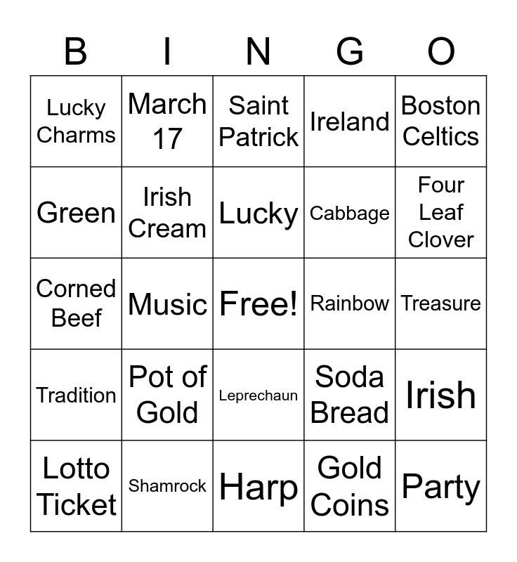 This bingo card has a free space and 24 words: Pot of Gold, Shamrock, Lucky, Lotto Ticket, Boston Celtics, Lucky Charms, Green, March 17, Rainbow, Leprechaun, Cabbage, Corned Beef, Soda Bread, Irish, Irish Cream, Gold Coins, Treasure, Saint Patrick, Four Leaf Clover, Music, Party, Tradition, Ireland and Harp.