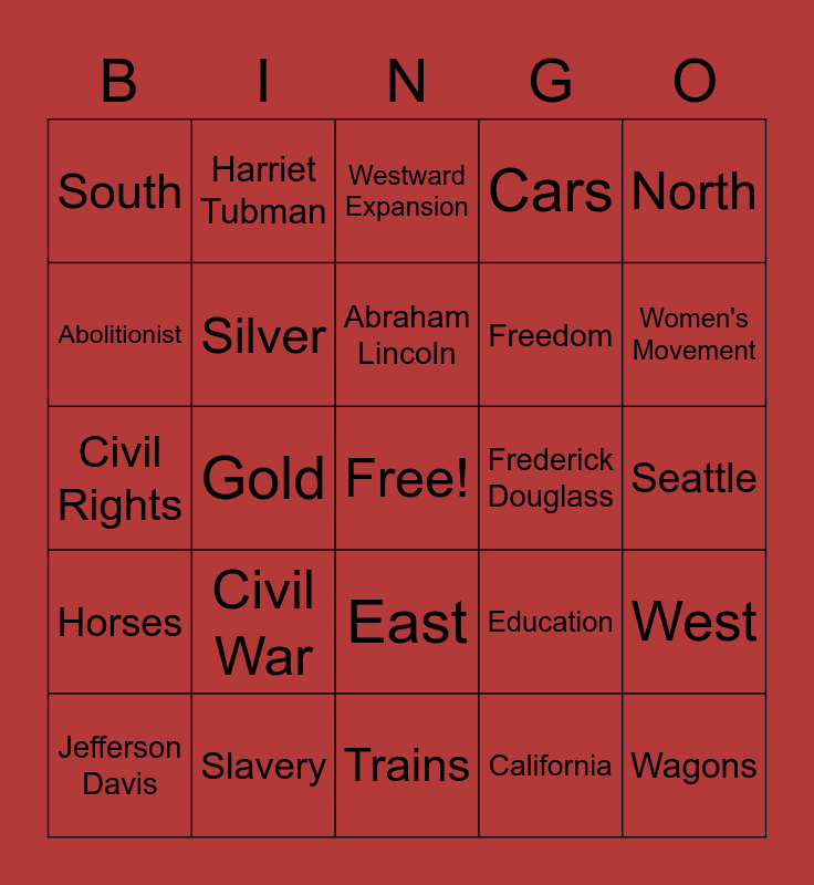 This bingo card has a free space and 24 words: Civil War, Slavery, Abraham Lincoln, Jefferson Davis, North, South, Abolitionist, Harriet Tubman, Frederick Douglass, East, Freedom, Civil Rights, Education, West, Silver, California, Seattle, Westward Expansion, Women's Movement, Gold, Wagons, Horses, Cars and Trains.
