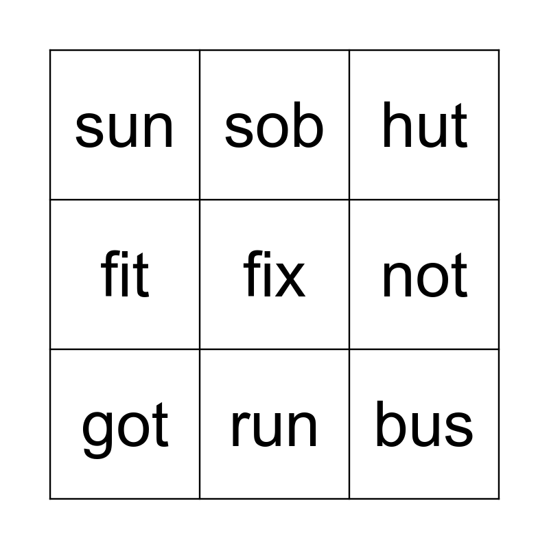 This bingo card has a free space and 14 words: bug, zip, got, sob, fit, bus, bib, fun, run, sun, van, not, hut and tan.