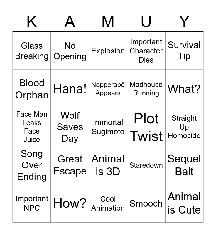 This bingo card has a free space and 27 words: Staredown, Punch, Madhouse Running, Cool Animation, Blood Orphan, Explosion, No Opening, Song Over Ending, Plot Twist, Sequel Bait, Face Man Leaks Face Juice, Important Character Dies, Important NPC, How?, What?, Flashback, Hana!, Nopperabō Appears, Great Escape, Glass Breaking, Straight Up Homocide, Smooch, Wolf Saves Day, Animal is Cute, Animal is 3D, Survival Tip and New Party Member.