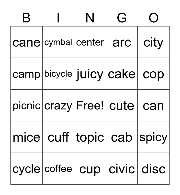 This bingo card has a free space and 34 words: cent, civic, fancy, cigar, mice, bicycle, city, cycle, cymbal, circle, juicy, center, rice, code, cute, cop, coffee, picnic, cuff, cab, topic, coat, cane, can, cup, disc, arc, cite, cake, camp, cell, crazy, spicy and castle.