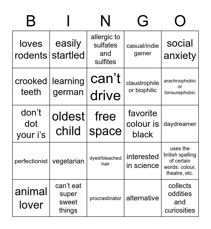 This bingo card has a free space and 24 words: vegetarian, can’t eat super sweet things, can’t drive, animal lover, social anxiety, loves rodents, crooked teeth, easily startled, favorite colour is black, dyed/bleached hair, claustrophile or biophilic, don’t dot your i’s, interested in science, uses the british spelling of certain words: colour, theatre, etc., learning german, alternative, daydreamer, allergic to sulfates and sulfites, arachnophobic or tonsurephobic, oldest child, collects oddities and curiosities, perfectionist, casual/indie gamer and procrastinator.