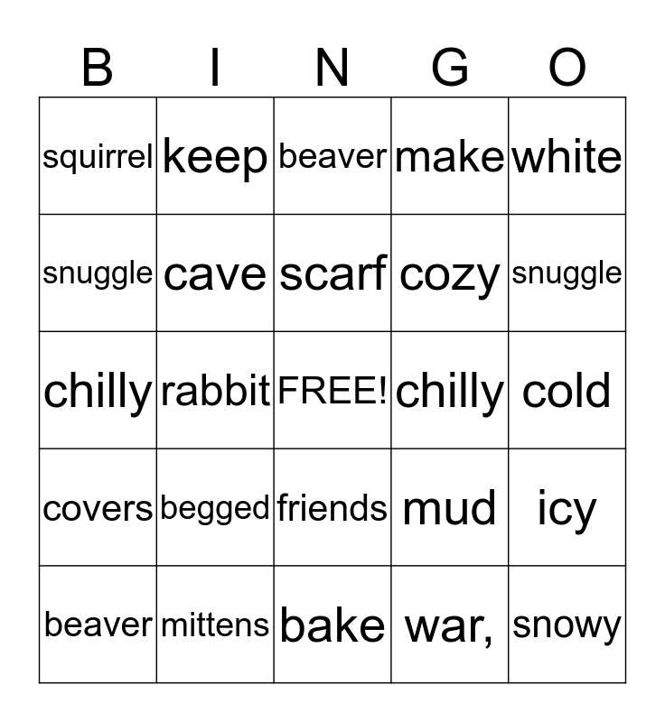 This bingo card has a free space and 24 words: begged, mittens, scarf, beaver, white, squirrel, snuggle, keep, chilly, friends, cozy, chilly, mud, icy, cave, war,, cold, beaver, snuggle, rabbit, snowy, covers, make and bake.