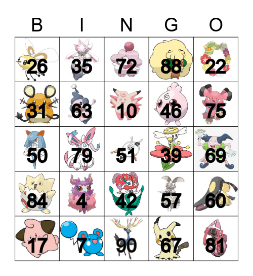 This bingo card has 24 images, a free space and 24 words: 4, 7, 10, 17, 22, 26, 31, 35, 39, 42, 46, 50, 57, 60, 63, 67, 69, 72, 75, 79, 81, 84, 88 and 90.