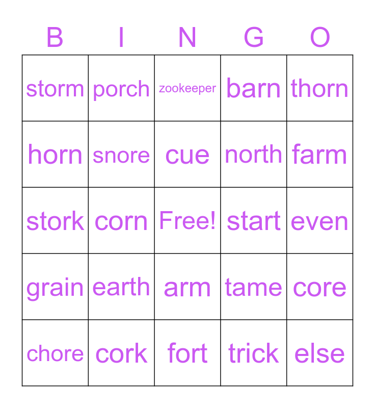 This bingo card has a free space and 24 words: chore, earth, cue, trick, thorn, storm, porch, zookeeper, start, even, stork, snore, tame, core, horn, cork, fort, barn, farm, grain, corn, arm, north and else.