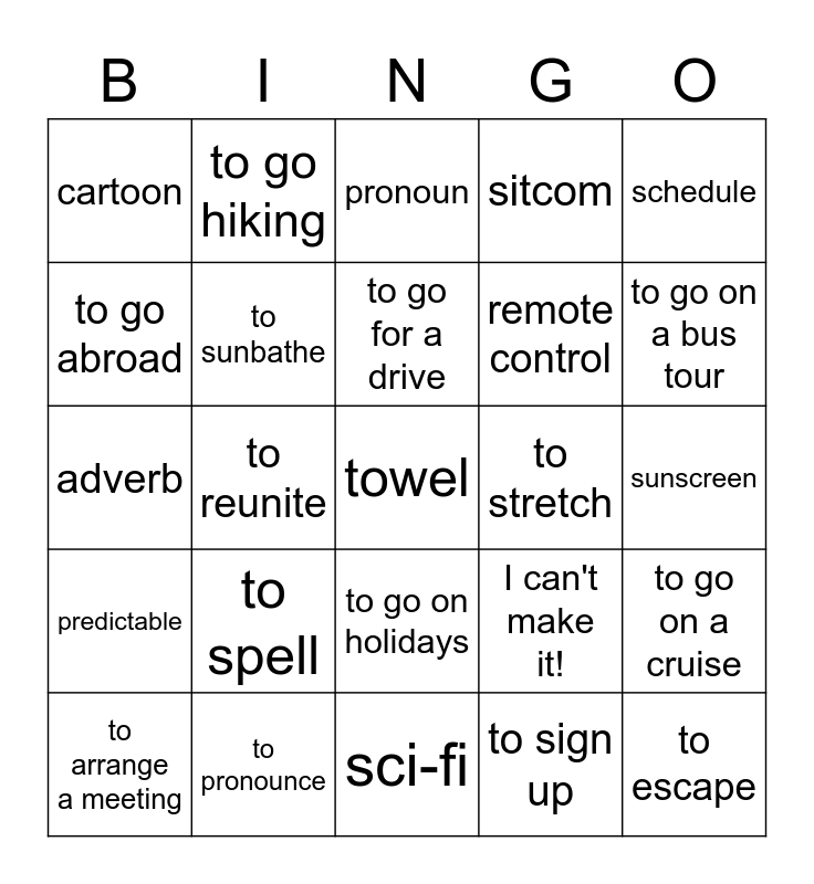 This bingo card has a free space and 24 words: to spell, to pronounce, to go for a drive, to arrange a meeting, schedule, cartoon, to go abroad, to go hiking, to stretch, to go on holidays, remote control, adverb, I can't make it!, to go on a cruise, to sunbathe, to sign up, sunscreen, pronoun, to go on a bus tour, to reunite, to escape, predictable, sitcom and sci-fi.