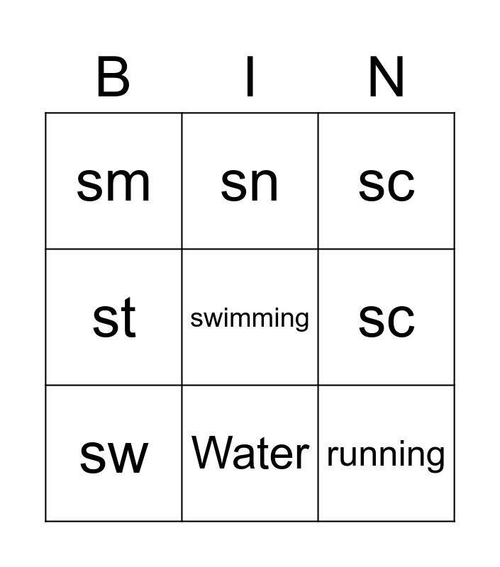 This bingo card has 9 words: sw, sc, sn, st, sm, sc, swimming, running and Water.