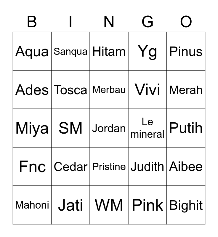 This bingo card has a free space and 24 words: Cedar, Jati, Merbau, Mahoni, Pinus, Aqua, Ades, Sanqua, Le mineral, Pristine, Vivi, Miya, Judith, Aibee, Tosca, Pink, Putih, Hitam, Merah, SM, Bighit, Fnc, Yg and WM.