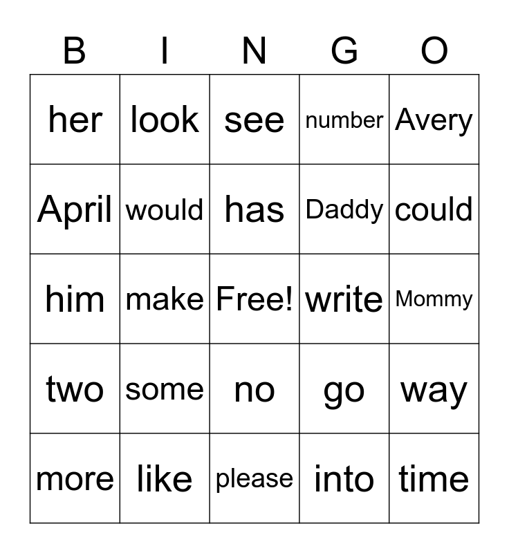 This bingo card has a free space and 24 words: some, like, has, more, Avery, her, April, look, write, no, Daddy, him, go, way, would, into, Mommy, see, could, make, time, two, number and please.
