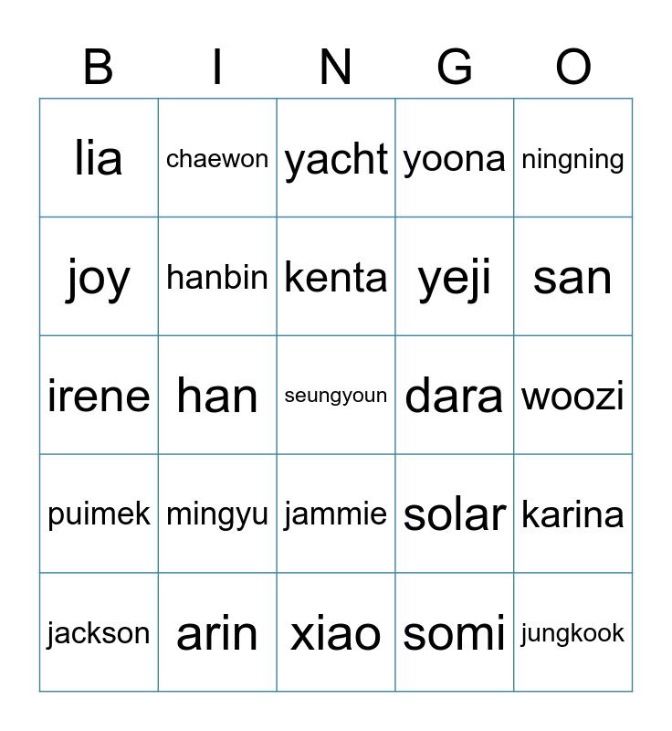 This bingo card has 25 words: mingyu, xiao, kenta, jackson, ningning, lia, joy, chaewon, dara, jammie, yeji, irene, solar, karina, hanbin, jungkook, woozi, yacht, san, han, seungyoun, arin, puimek, yoona and somi.
