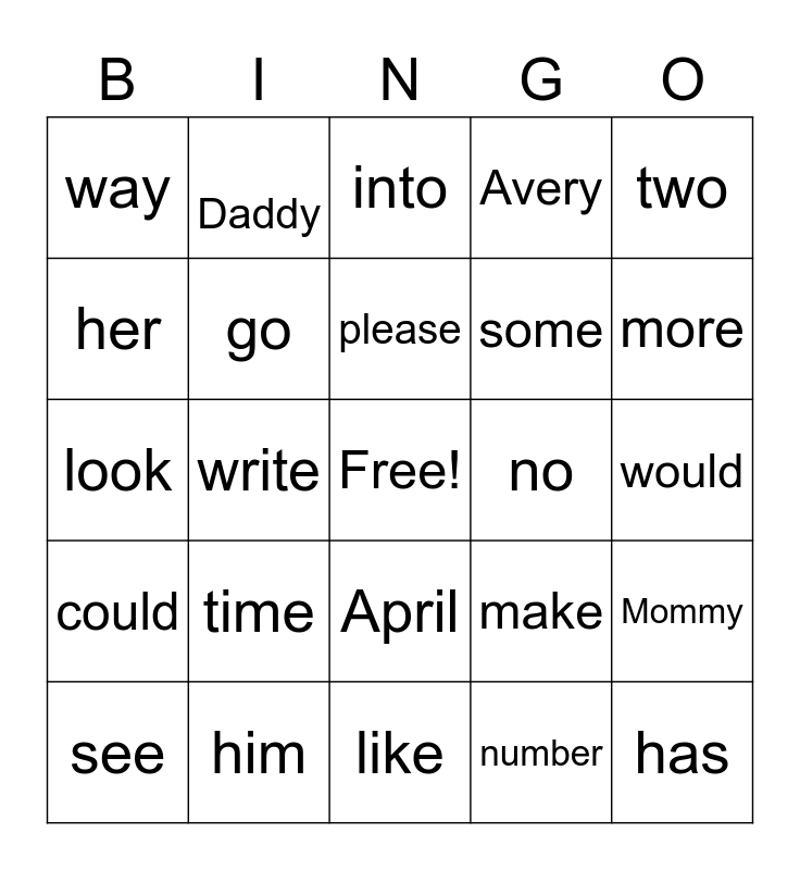 This bingo card has a free space and 24 words: time, him, please, see, two, way, her, Daddy, no, April, some, look, make, Mommy, go, number, would, into, more, write, has, could, Avery and like.