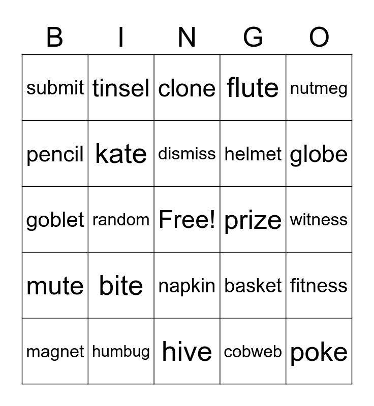 This bingo card has a free space and 26 words: napkin, cobweb, dismiss, humbug, nutmeg, submit, pencil, tinsel, witness, basket, helmet, goblet, fitness, magnet, random, fluke, flute, mute, clone, poke, globe, hive, prize, bite, kate and glaze.