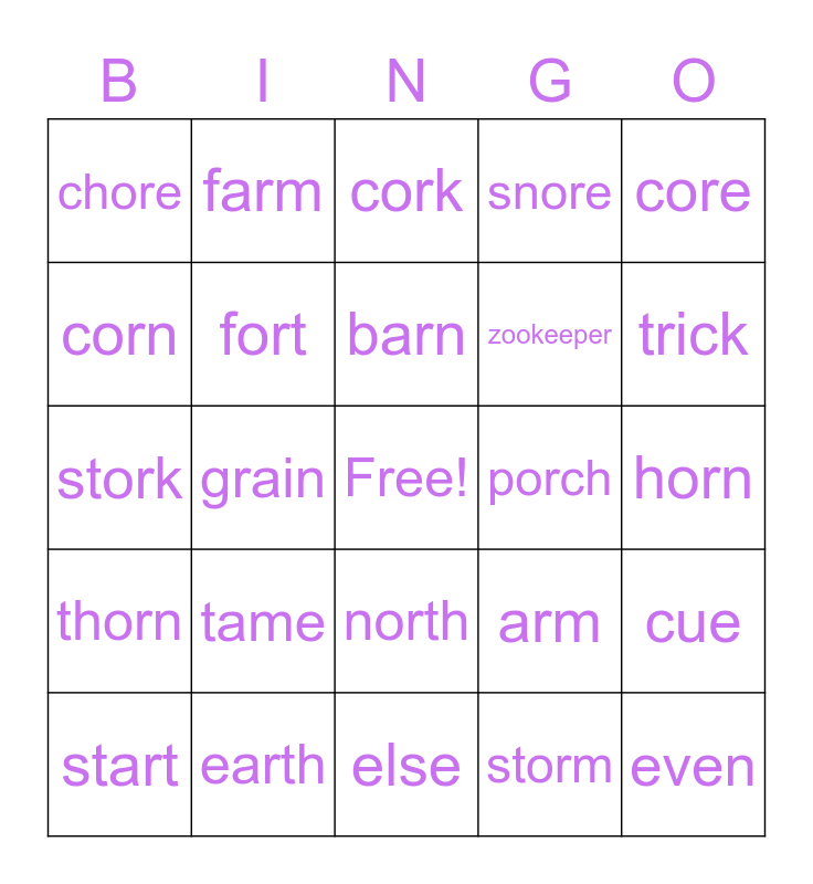 This bingo card has a free space and 24 words: tame, earth, barn, start, core, chore, corn, farm, porch, north, zookeeper, stork, arm, cue, fort, storm, horn, cork, trick, grain, even, thorn, snore and else.