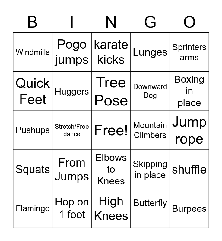 This bingo card has a free space and 28 words: shuffle, Toe raises, Downward Dog, Butterfly, Quick Feet, karate kicks, Pogo jumps, Squats, Mountain Climbers, Flamingo, Pushups, Lunges, Hop on 1 foot, High Knees, Boxing in place, Plank, From Jumps, Huggers, Tree Pose, Elbows to Knees, Windmills, Ski Jumps, Burpees, Stretch/Free dance, Jump rope, Skipping in place, Sprinters arms and Bottom Kickers.