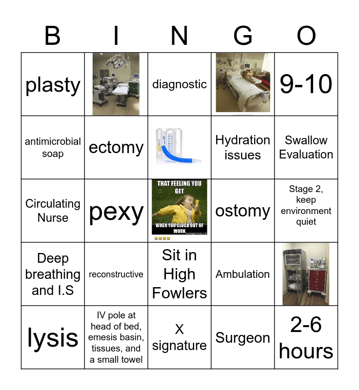 This bingo card has 5 images, a free space and 24 words: lysis, elective, pexy, emergency, plasty, diagnostic, ectomy, reconstructive, ostomy, IV pole at head of bed, emesis basin, tissues, and a small towel, Stage 2, keep environment quiet, 2-6 hours, X signature, Surgeon, Swallow Evaluation, surgical site marked by patient, Sit in High Fowlers, Deep breathing and I.S, 9-10, Circulating Nurse, Ambulation, 30mL/Hr, Hydration issues and antimicrobial soap.