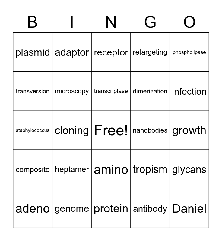 This bingo card has a free space and 43 words: Alina, Daniel, Doctor, adeno, capsid, antibody, receptor, virus, phospholipase, genome, retargeting, nanobodies, amino, heptamer, membrane, protein, in vivo, staphylococcus, cancer, infection, adaptor, peptide, nanoparticles, plasmid, assay, growth, Jurkat, cytometry, tropism, composite, particles, glycans, in vitro, cloning, receptor, synthetic, conjugation, transcriptase, transversion, dimerization, bioluminescence, microscopy and thermocycler.