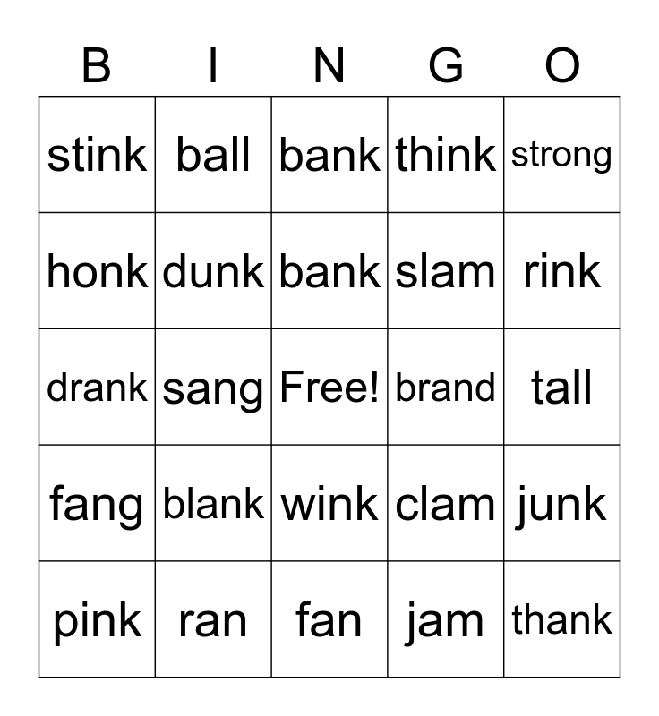 This bingo card has a free space and 24 words: blank, ran, bank, pink, strong, stink, honk, ball, brand, wink, slam, drank, clam, junk, dunk, jam, tall, bank, rink, sang, thank, fang, think and fan.