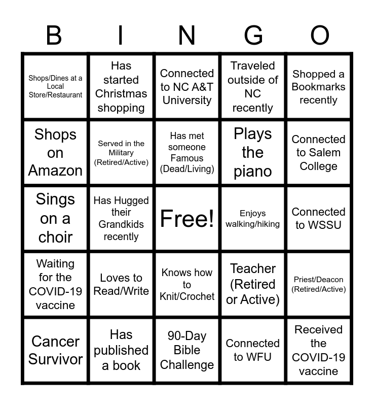 This bingo card has a free space and 24 words: Loves to Read/Write, Has published a book, Has met someone Famous (Dead/Living), Cancer Survivor, Shopped a Bookmarks recently, Shops/Dines at a Local Store/Restaurant, Shops on Amazon, Has started Christmas shopping, Enjoys walking/hiking, Knows how to Knit/Crochet, Plays the piano, Sings on a choir, Teacher (Retired or Active), Priest/Deacon (Retired/Active), Served in the Military (Retired/Active), Connected to WFU, Connected to WSSU, Connected to NC A&T University, Connected to Salem College, Has Hugged their Grandkids recently, Received the COVID-19 vaccine, Waiting for the COVID-19 vaccine, Traveled outside of NC recently and 90-Day Bible Challenge.