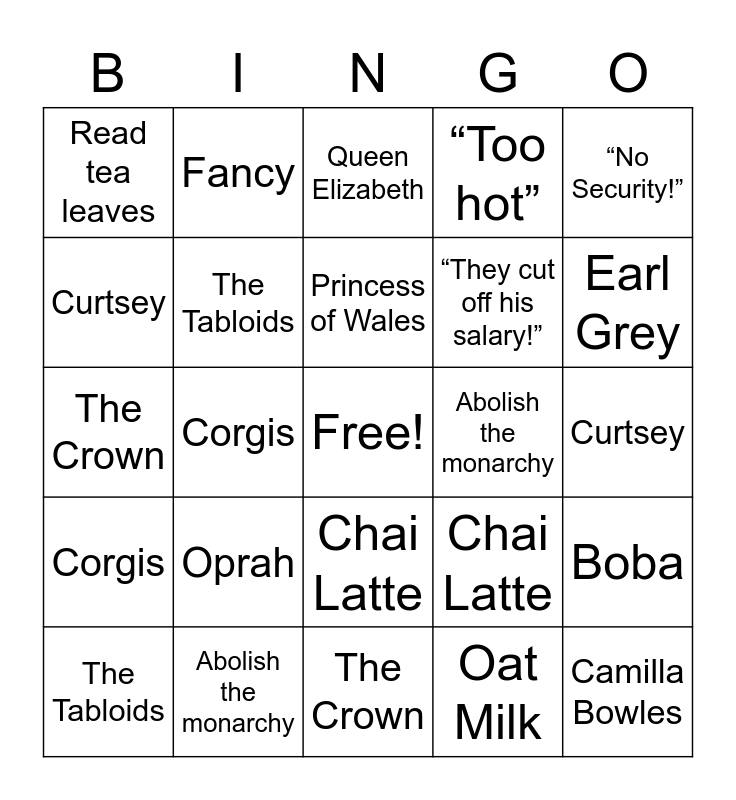 This bingo card has a free space and 47 words: Queen Elizabeth, Camilla Bowles, The Firm, The Crown, Oprah, Earl Grey, Fancy, “I don’t drink coffee”, Curtsey, Royal Wedding, The Tabloids, “Too hot”, Boba, Chai Latte, Archie Mountbatten-Windsor, Tyler Perry, Princess of Wales, Abolish the monarchy, Freedom or Independence, “No Security!”, Corgis, Oat Milk, Read tea leaves, “They cut off his salary!”, “They cut off his salary!”, Earl Grey, The Tabloids, “No Security!”, Chai Latte, Corgis, Archie Mountbatten-Windsor, Freedom or Independence, Boba, Oat Milk, Read tea leaves, Abolish the monarchy, Curtsey, “Too hot”, Tyler Perry, Fancy, Princess of Wales, Queen Elizabeth, The Crown, Royal Wedding, The Firm, Camilla Bowles and “I don’t drink coffee”.
