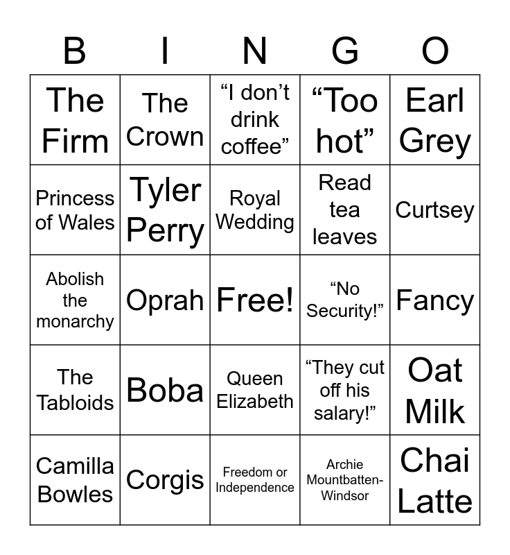 This bingo card has a free space and 24 words: Boba, Corgis, Royal Wedding, Camilla Bowles, Earl Grey, The Firm, Princess of Wales, The Crown, “No Security!”, Queen Elizabeth, Read tea leaves, Abolish the monarchy, “They cut off his salary!”, Oat Milk, Tyler Perry, Archie Mountbatten-Windsor, Fancy, “I don’t drink coffee”, Curtsey, Oprah, Chai Latte, The Tabloids, “Too hot” and Freedom or Independence.