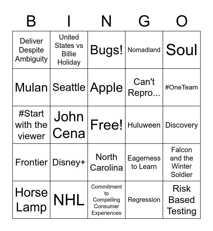 This bingo card has a free space and 29 words: Horse Lamp, Titan, John Cena, #ThinkBig, Deliver Despite Ambiguity, Bugs!, Seattle, Disney+, Huluween, NHL, Discovery, Risk Based Testing, Commitment to Compelling Consumer Experiences, Regression, #OneTeam, New York, North Carolina, Frontier, Soul, #Start with the viewer, Eagerness to Learn, Onward, Can't Repro..., Mulan, Nomadland, United States vs Billie Holiday, Falcon and the Winter Soldier, Apple and ESPN+.