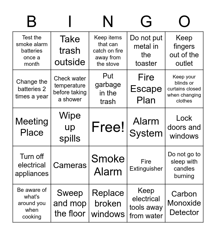 This bingo card has a free space and 26 words: Smoke Alarm, Keep electrical tools away from water, Put garbage in the trash, Sweep and mop the floor, Keep fingers out of the outlet, Test the smoke alarm batteries once a month, Change the batteries 2 times a year, Take trash outside, Lock doors and windows, Fire Extinguisher, Fire Escape Plan, Meeting Place, Do not go to sleep with candles burning, Be aware of what's around you when cooking, Wipe up spills, Bath mat, Do not put metal in the toaster, Turn off electrical appliances, Keep items that can catch on fire away from the stove, Carbon Monoxide Detector, Keep your blinds or curtains closed when changing clothes, Replace broken windows, Alarm System, Cameras, Check water temperature before taking a shower and Stay in the kitchen when cooking on the stove.