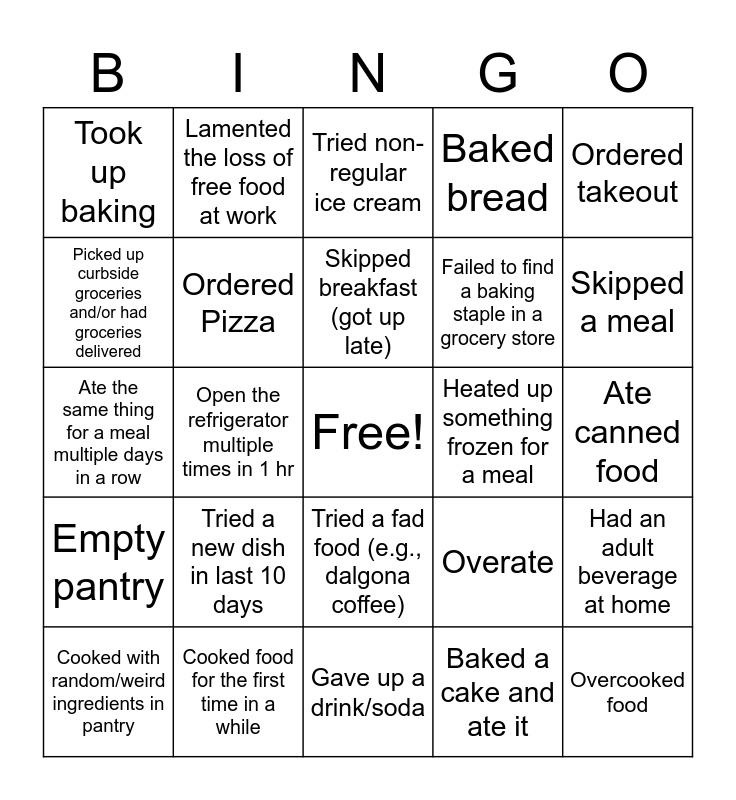 This bingo card has a free space and 24 words: Tried a new dish in last 10 days, Cooked food for the first time in a while, Skipped breakfast (got up late), Cooked with random/weird ingredients in pantry, Ordered takeout, Took up baking, Picked up curbside groceries and/or had groceries delivered, Lamented the loss of free food at work, Heated up something frozen for a meal, Tried a fad food (e.g., dalgona coffee), Failed to find a baking staple in a grocery store, Ate the same thing for a meal multiple days in a row, Overate, Had an adult beverage at home, Ordered Pizza, Baked a cake and ate it, Ate canned food, Tried non-regular ice cream, Skipped a meal, Open the refrigerator multiple times in 1 hr, Overcooked food, Empty pantry, Baked bread and Gave up a drink/soda.