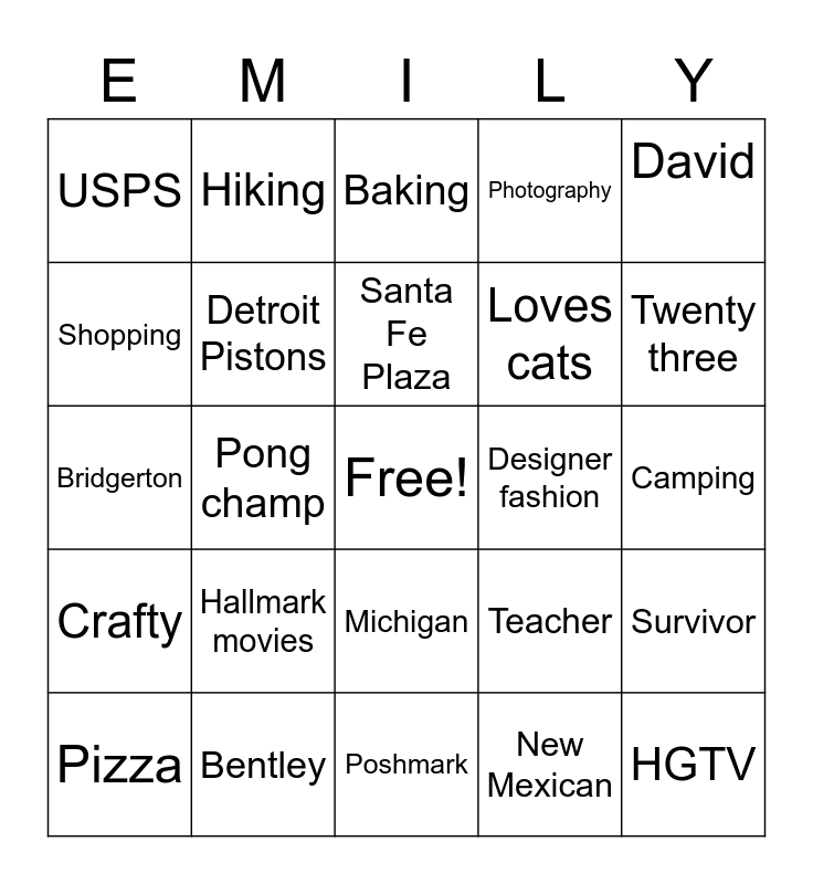 This bingo card has a free space and 26 words: Michigan, New Mexican, Santa Fe Plaza, Bentley, David, USPS, Shopping, Hiking, Camping, Teacher, Loves cats, Bridgerton, Survivor, Pizza, Pong champ, Cars, Photography, Crafty, Baking, HGTV, Twenty three, Poshmark, Designer fashion, Hallmark movies, Detroit Pistons and Jeremy Meeks.
