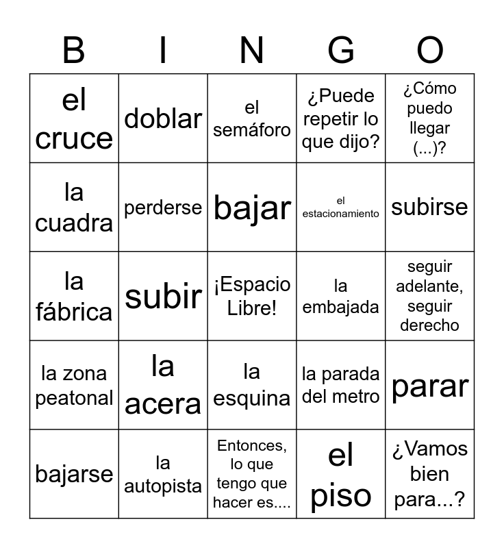 This bingo card has a free space and 24 words: la acera, la autopista, bajar, bajarse, ¿Cómo puedo llegar (...)?, el cruce, la cuadra, doblar, la embajada, la esquina, el estacionamiento, la fábrica, la parada del metro, parar, perderse, el piso, seguir adelante, seguir derecho, el semáforo, subirse, subir, ¿Vamos bien para...?, la zona peatonal, ¿Puede repetir lo que dijo? and Entonces, lo que tengo que hacer es.....