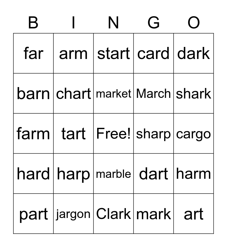 This bingo card has a free space and 29 words: part, cart, tart, warf, far, start, chart, harp, sharp, jargon, cargo, art, Clark, mark, shark, yarn, marble, hard, dark, farm, dart, charm, March, barn, card, arm, harm, market and bark.