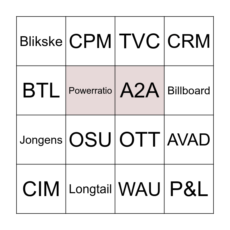 This bingo card has 53 words: GRP, CIM, Speerpunt, Highlight, Traffic, Impressie, CPM, Bestedingsaandeel, Powerratio, DAI, A2A, Zipping, Zapping, G2M, D2C, Jingle, Billboard, Longtail, ATL, BTL, AVAD, ATV, Jongens, Blikske, Nutjes, awareness, VVA, TSV, nPVR, OSU, rating, Effective reach, OTS, BAM, CAM, DCC, CRM, Tone of voice, TVC, Key visual, FOC, MAU, WAU, fill rate, longform, shortform, programmatic, inventory, OTT, P&L, Trading, Affinity and CPS.