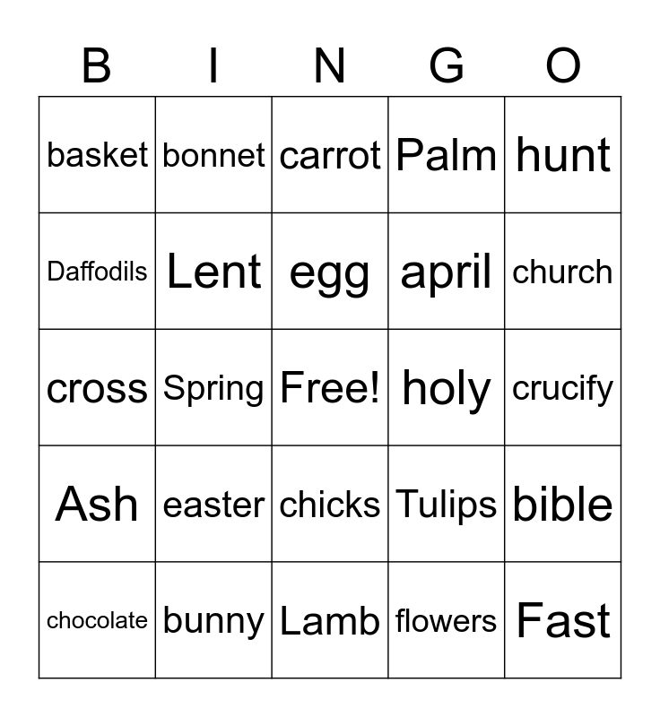 This bingo card has a free space and 24 words: easter, bunny, egg, chocolate, hunt, basket, Daffodils, bonnet, holy, chicks, april, cross, Tulips, bible, Lent, flowers, crucify, carrot, church, Spring, Fast, Ash, Palm and Lamb.