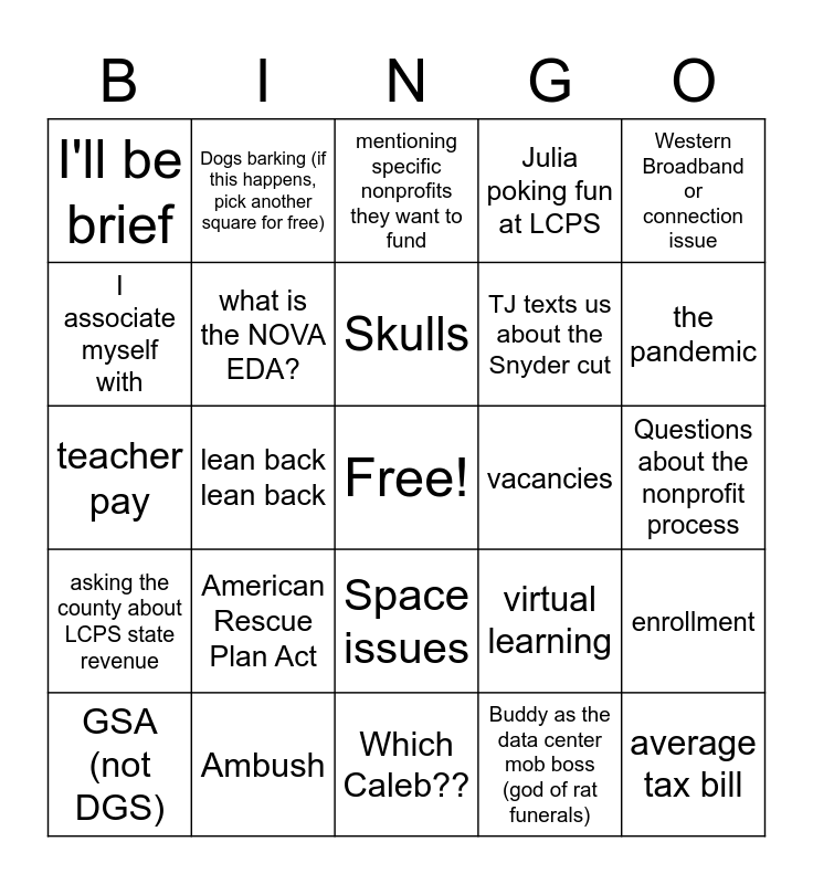 This bingo card has a free space and 24 words: American Rescue Plan Act, Ambush, Skulls, GSA (not DGS), Western Broadband or connection issue, I'll be brief, I associate myself with, Dogs barking (if this happens, pick another square for free), vacancies, Space issues, TJ texts us about the Snyder cut, teacher pay, virtual learning, enrollment, what is the NOVA EDA?, Buddy as the data center mob boss (god of rat funerals), Questions about the nonprofit process, mentioning specific nonprofits they want to fund, the pandemic, lean back lean back, average tax bill, asking the county about LCPS state revenue, Julia poking fun at LCPS and Which Caleb??.