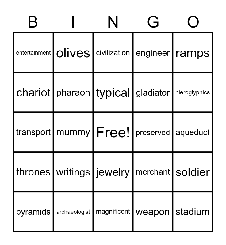 This bingo card has a free space and 29 words: pyramids, ancient, mummy, Romans, entertainment, civilization, pharaoh, writings, preserved, archaeologist, aqueduct, stadium, magnificent, weapon, hieroglyphics, amphitheater, jewelry, thrones, ramps, transport, merchant, soldier, gladiator, chariot, engineer, olives, soldier, typical and factual.